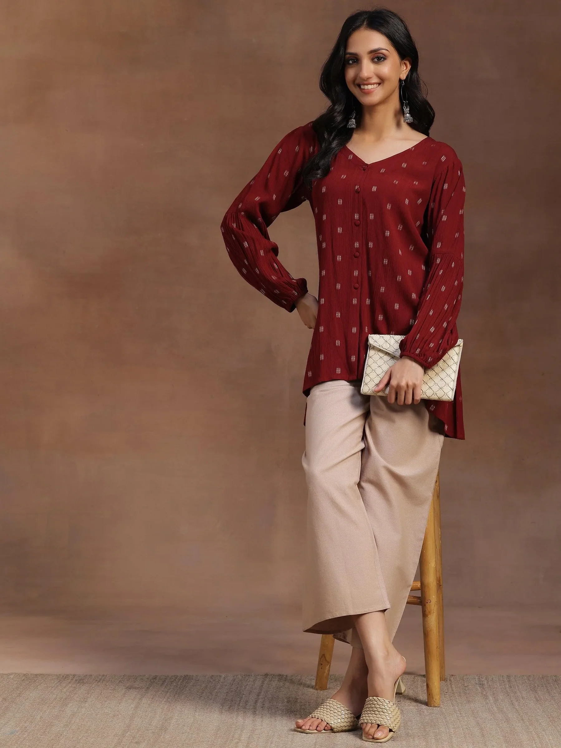 Maroon Woven Design Viscose Rayon A-line Kurti