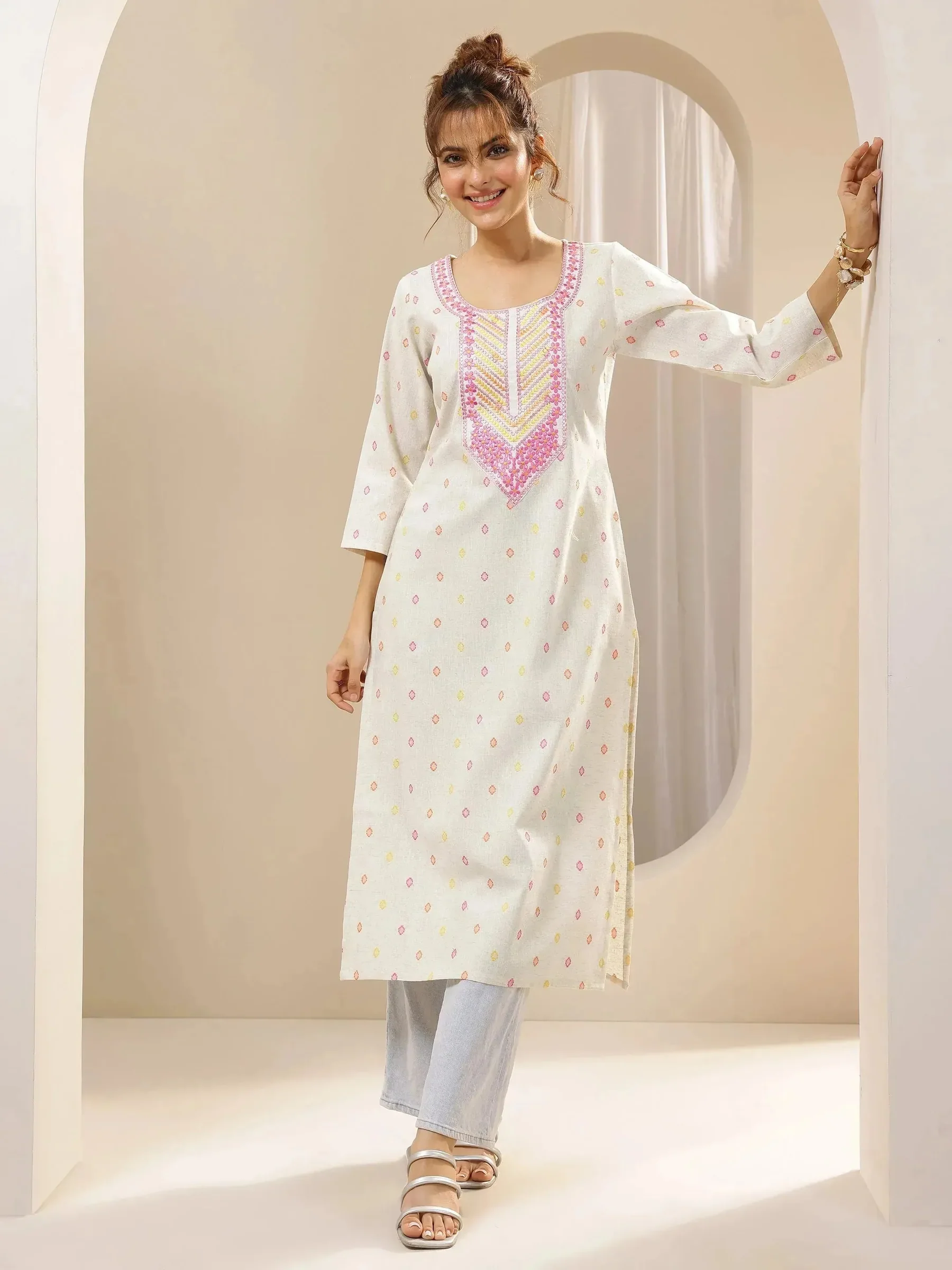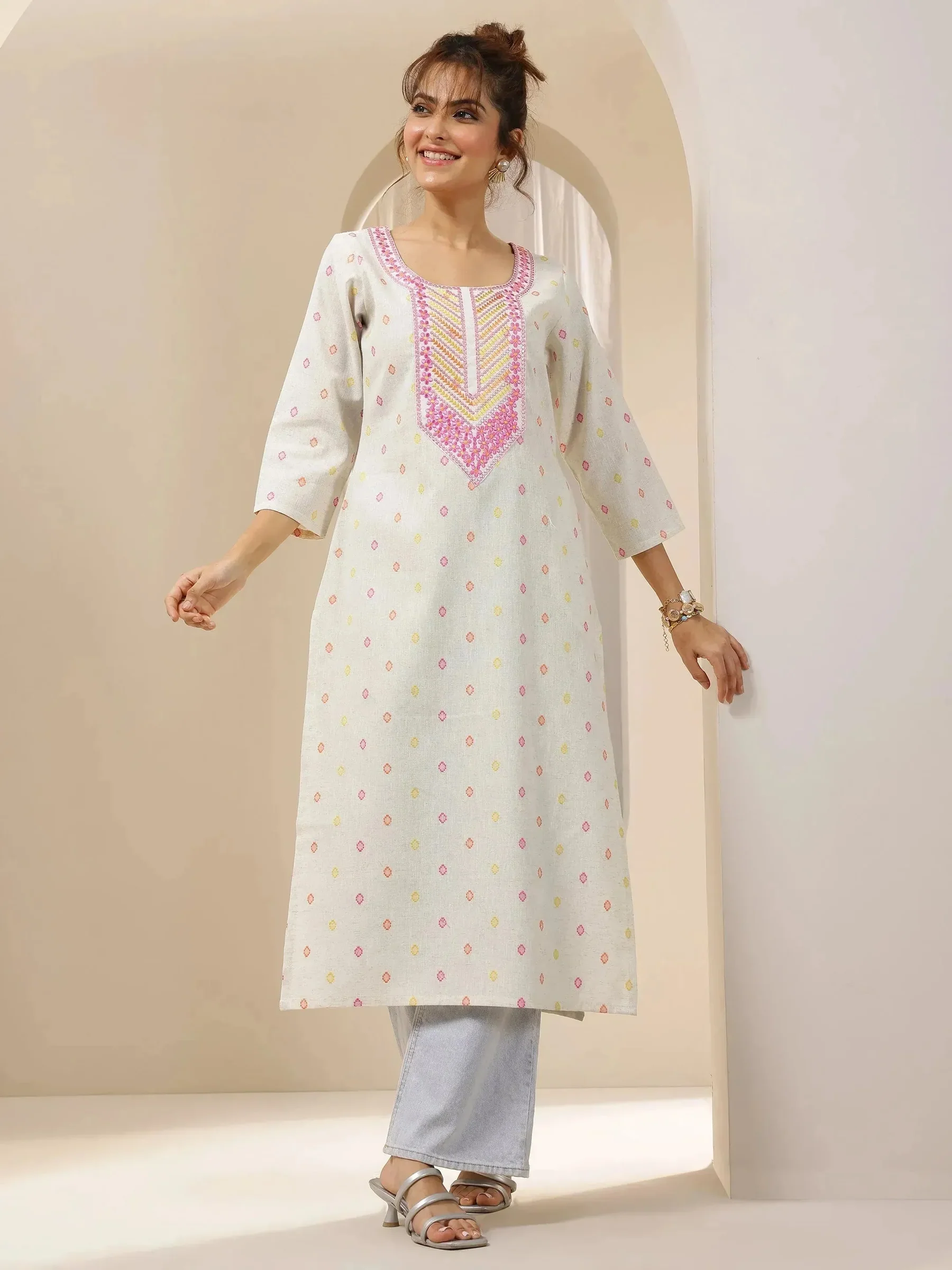 Off White Embroidered Cotton Straight Kurta